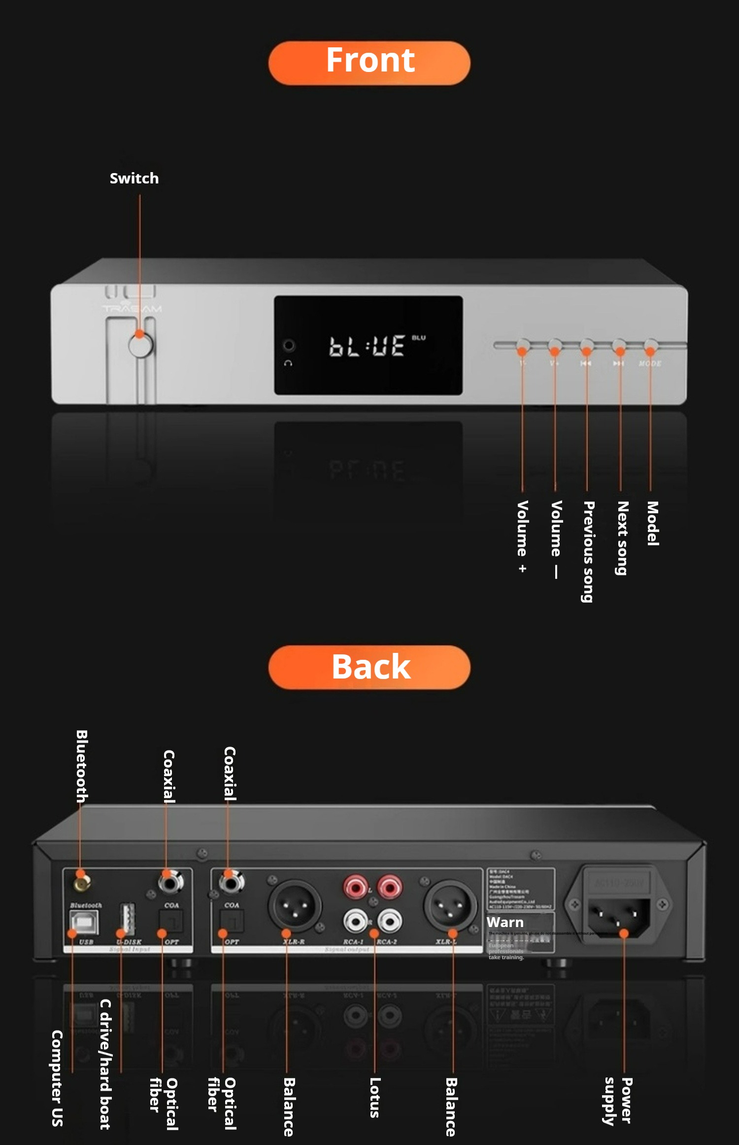 Output interface:Lotus output, balanced output Optical fiber coaxial output, 3.5 headphone jack output