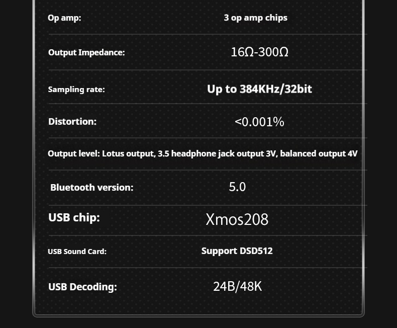 Output level: Lotus output, 3.5 headphone jack output 3V, balanced output 4V