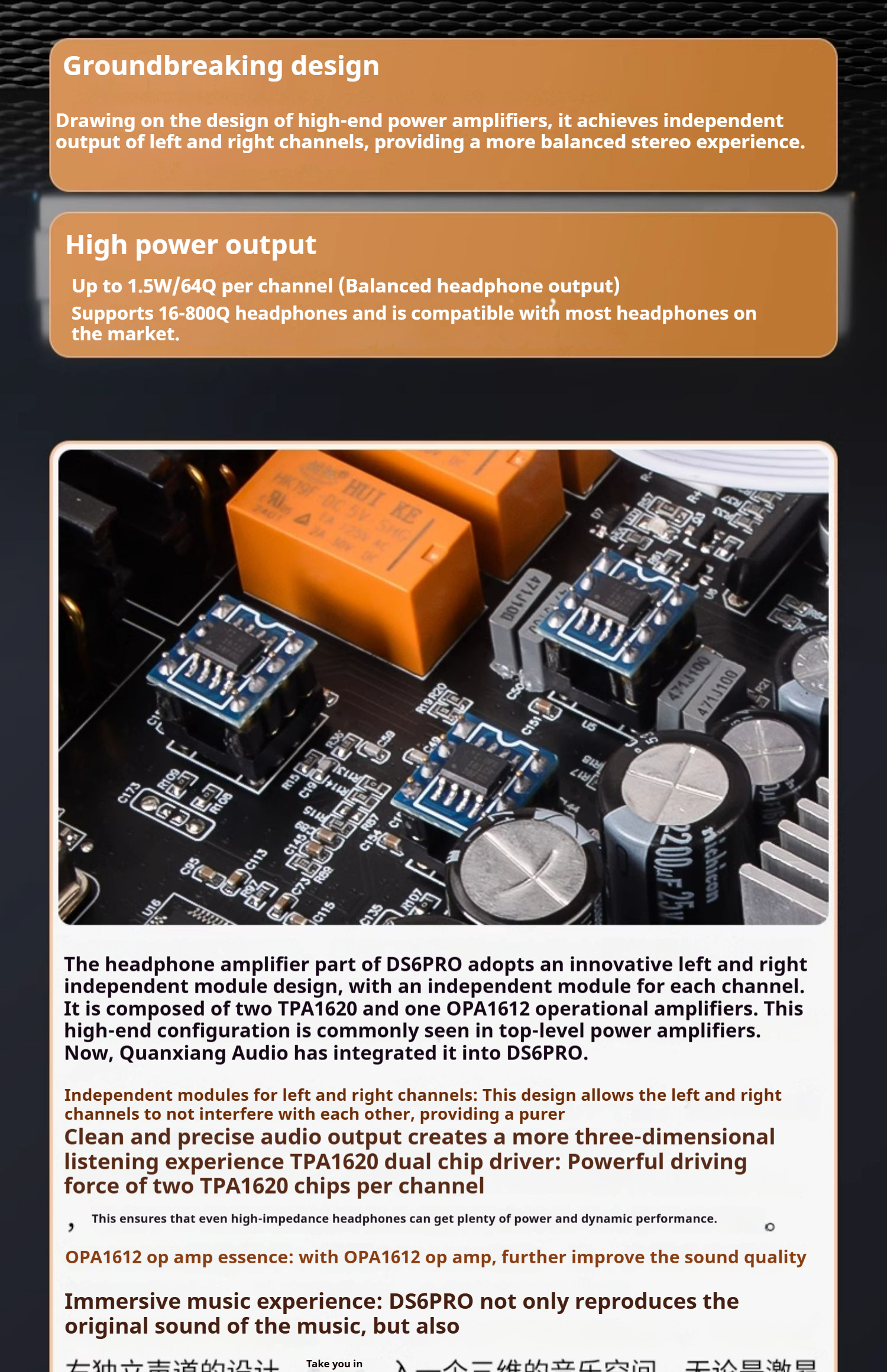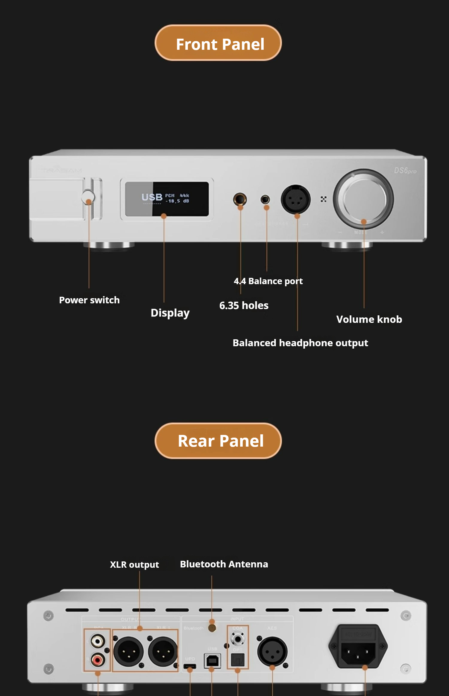 Headphoneoutput Audio features(6.35 single-ended):Qutputlevel(Vrms):6,4Vrms@0dB