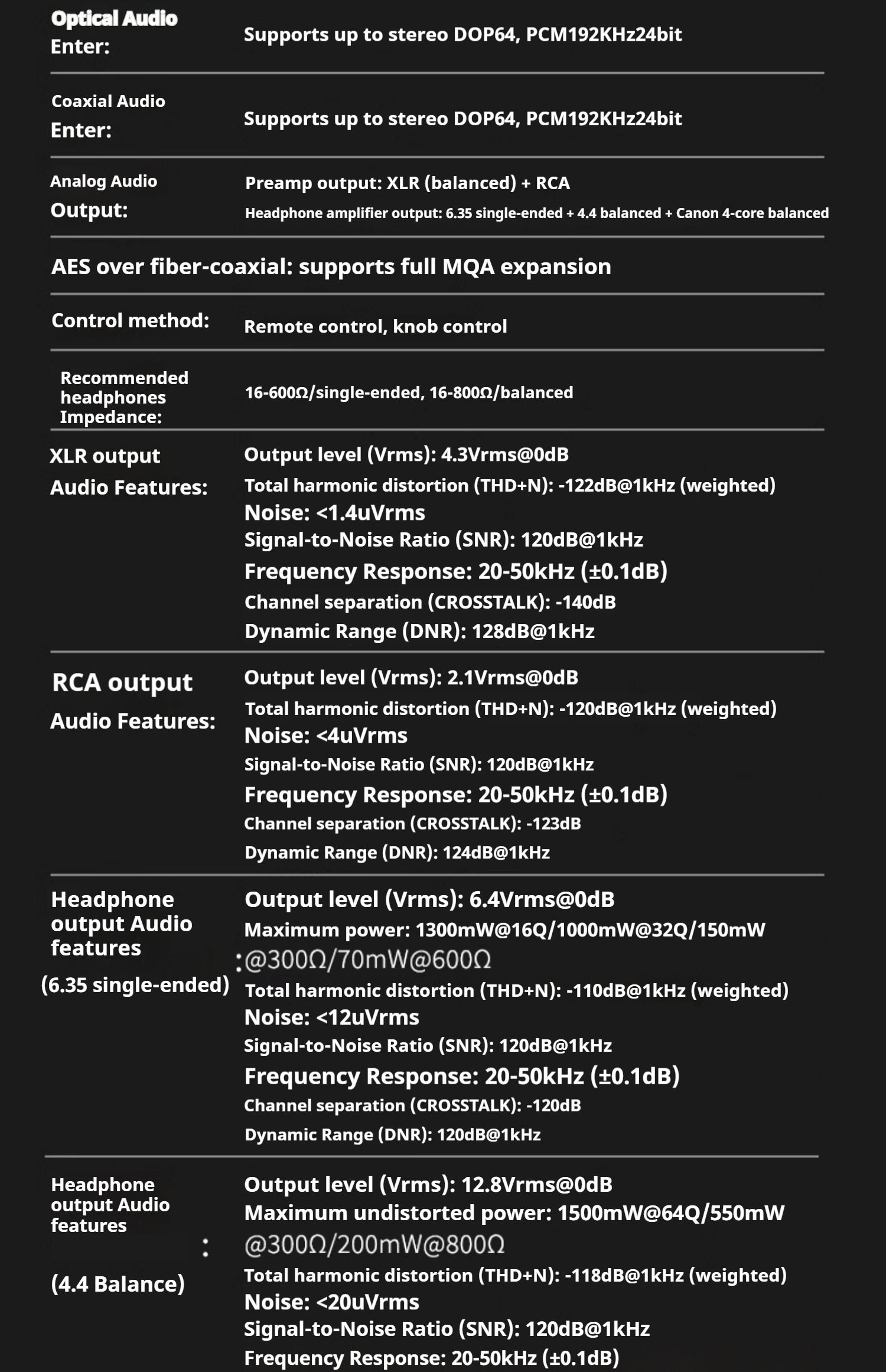 XLR outputAudio Features:Output level (Vrms): 4.3Vrms@0dBTotal harmonic distortion (THD+N):-122dB@1kHz(weighted)Noise:<1.4uVrmsSignal-to-Noise Ratio (SNR):120dB@1kHzFrequency Response:20-50kHz(±0.1dB)Channel separation(CROSSTALK): -140dBDynamic Range(DNR): 128dB@1kHz