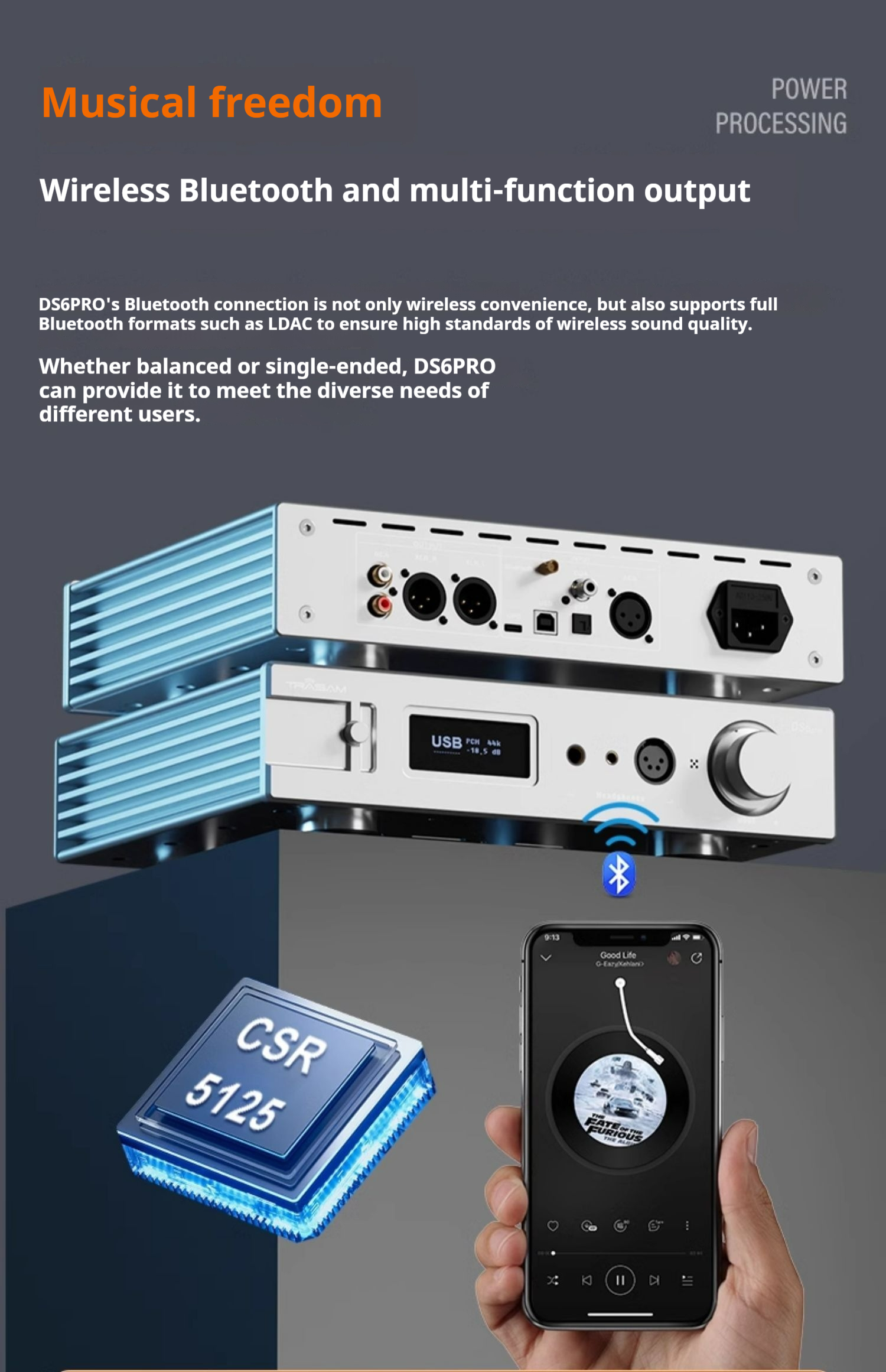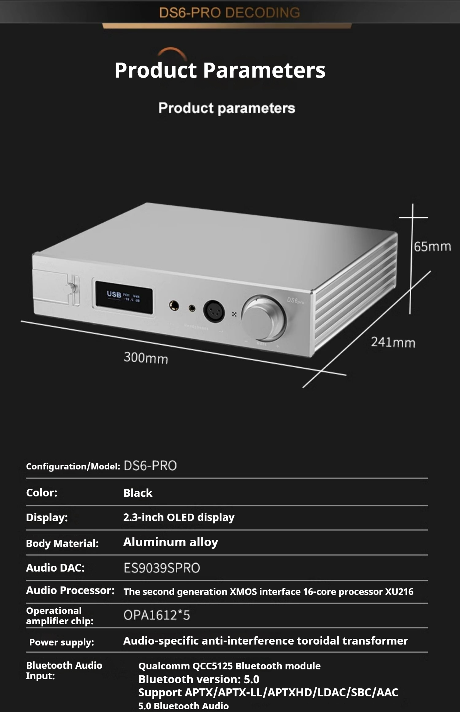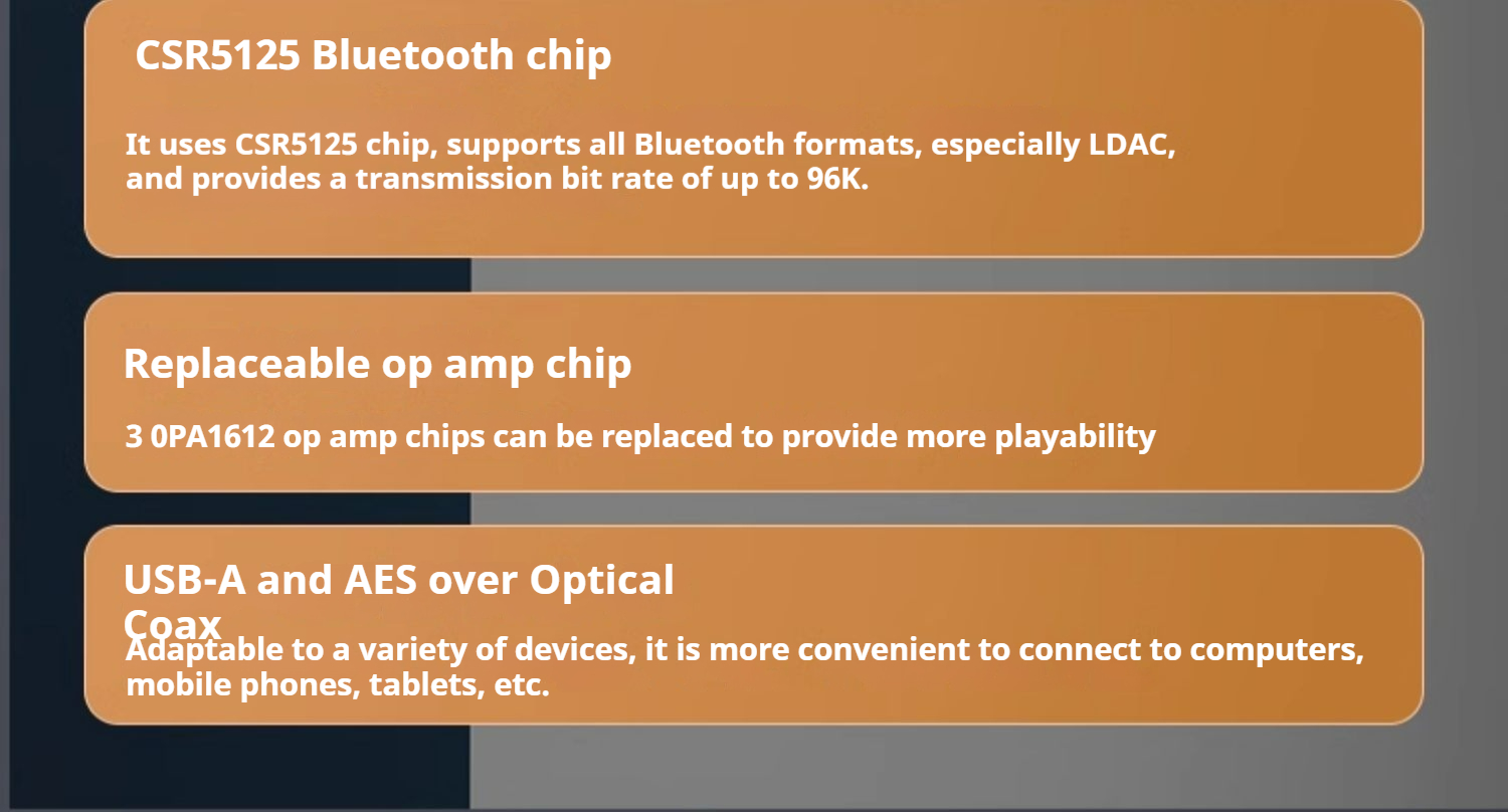 Bluetooth Audio Input:Qualcomm QCC5125; Bluetooth moduleBluetooth version:5.0;Support APTX/APTX-LL/APTXHD/LDAC/SBC/AACBluetooth Audio
