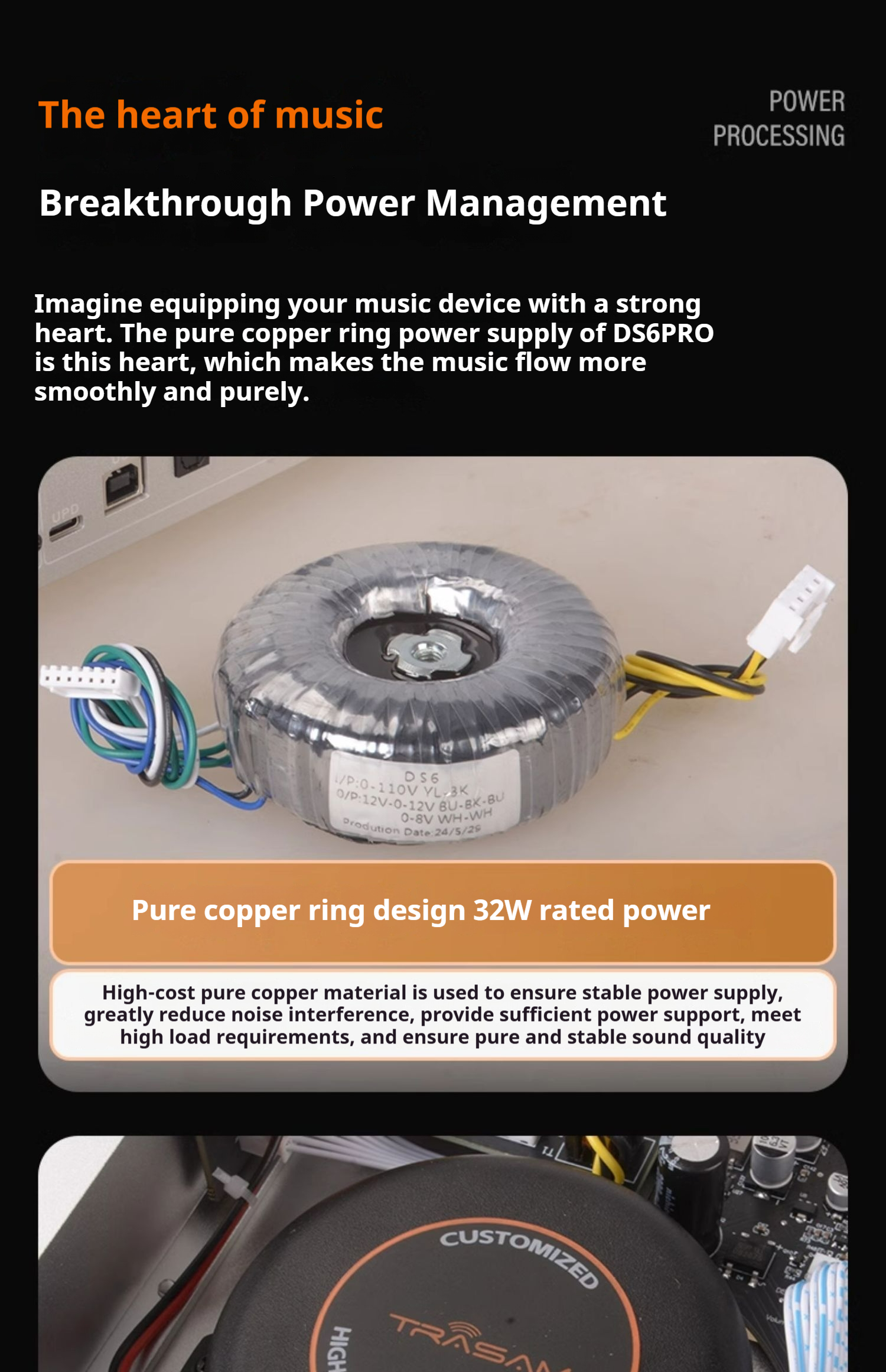 Power supply:Audio-specific anti-interference toroldal transformer